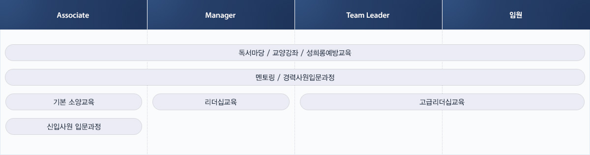 - 독서마당 / 교양강좌 / 성희롱예방교육, 멘토링 / 경력사원입문과정 = Associate, Manager, Team Leader, 임원